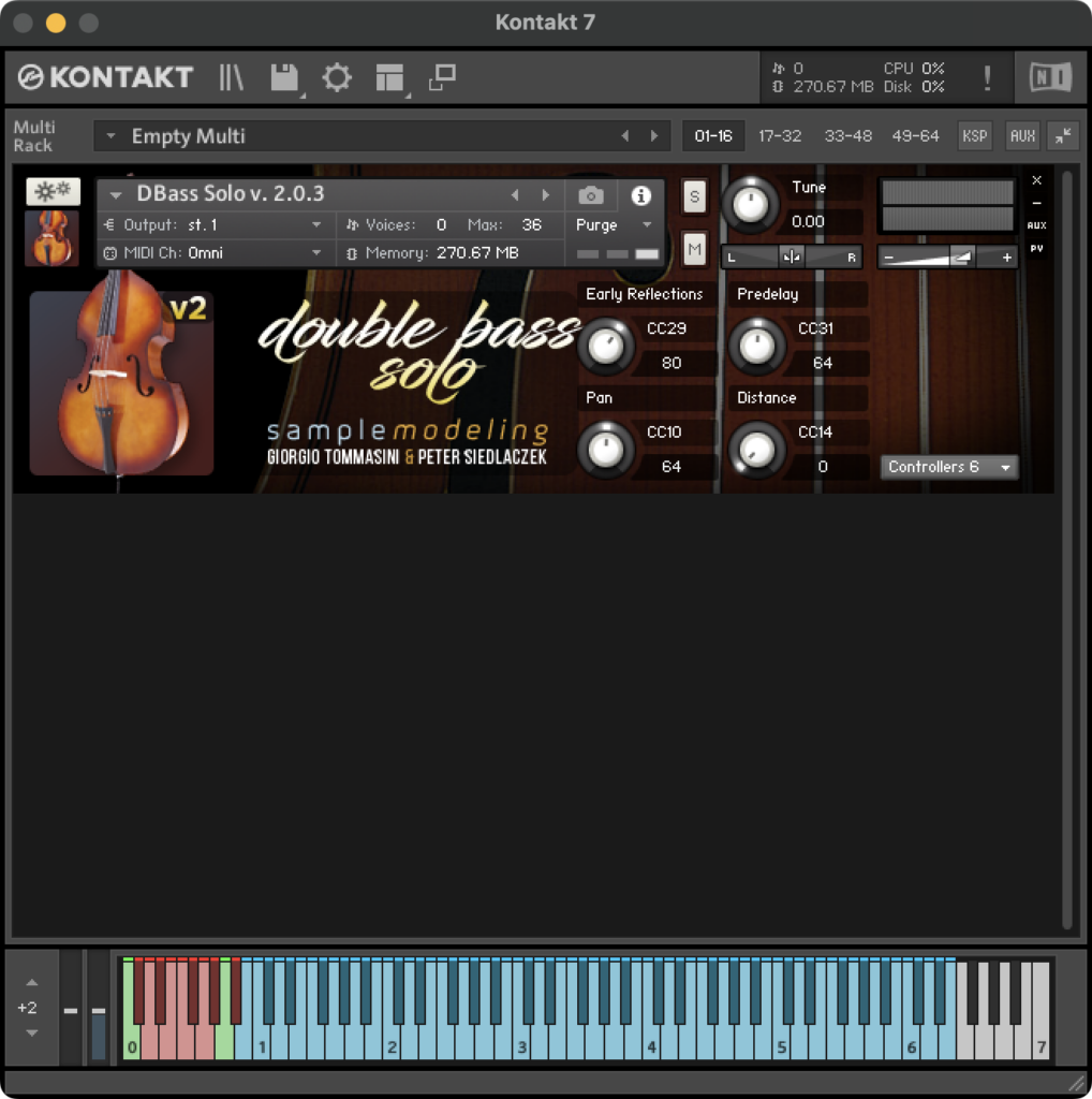 The Solo D.Bass further expands Samplemodeling™ technologies. Multi-microphone anechoic recording allows to capture the original timbre of the instruments, along with their radiation pattern. Our proprietary “Harmonic Alignment” yields continuous transitions across virtually infinite dynamics. Specially devised “early reflections” impulse responses add a virtual space to the anechoic sound, greatly contributing to realism. New, patent pending technology allows to vary the perceived size of the ensemble in a continuous manner. The programming moves further away from conventional libraries, by exploiting physically-oriented modulation of the recorded sound. The result is a playable and highly expressive virtual instrument that retains the rich, full sound of real strings. Samplemodeling Solo D.Bass includes 7 different sounding instruments and a sordino. The Strings engine is structured according to an adaptive model, based on the performance “fingerprints” of the real instruments. The purpose of the model is to minimize the differences between real phrases and those played by the virtual instruments. Proprietary instrument body IRs, innovative techniques for sample modulation and advanced artificial intelligence MIDI processing are used for real-time construction of all articulations and morphing across dynamics, vibrato, legato, portamento, cross-string, portato, trills, tremolo, staccato, pizzicato, col legno, harmonics and so forth. Pseudo-random detuning and pitch & dynamics modulation, based on real performance-derived trends, is another outstanding feature of the Solo D.Bass, adding further realism. Please note that these Solo Strings version 2.03 instruments will only run on Kontakt 7 and later. They are NKS compliant. This feature will be much appreciated by Komplete Kontrol and Maschine users.